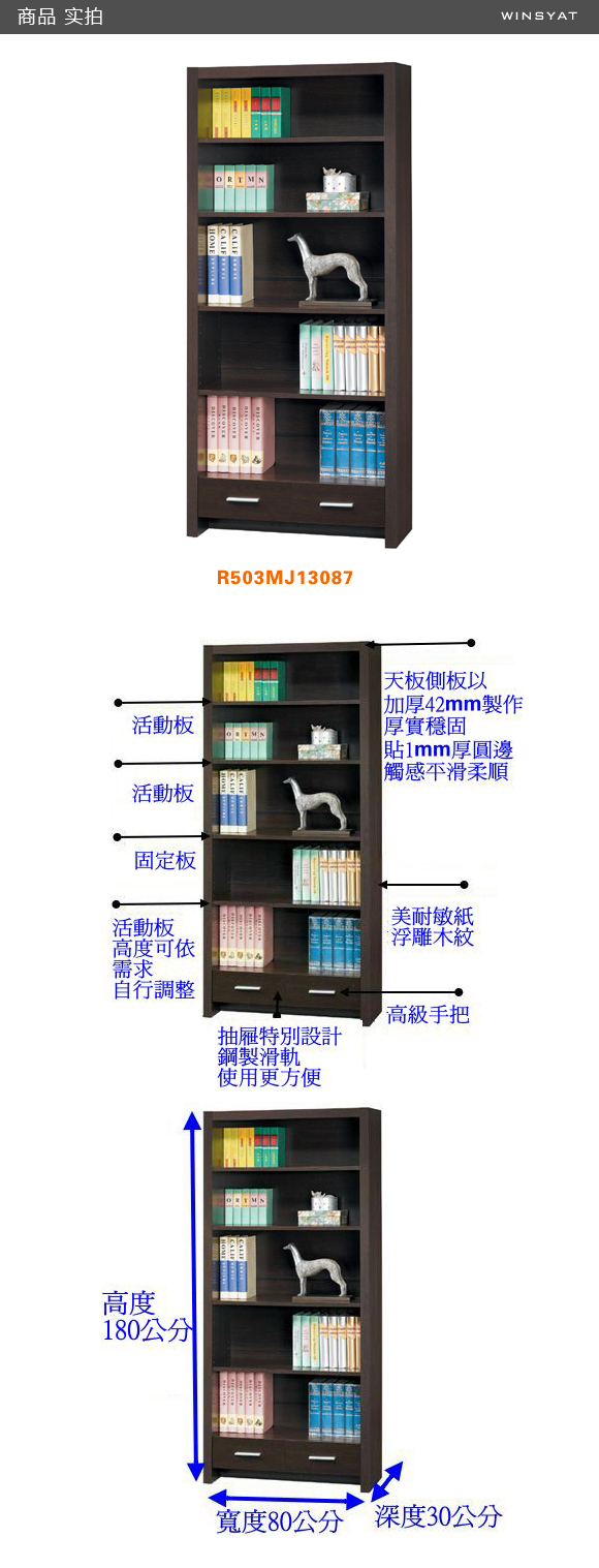 胡桃木色 42MM厚天板侧板,MDF(中密度纤维板)材质 常规手把,活动层板3片 美耐敏纸浮雕木纹,美观大方 尺寸:W800xD300xH1800