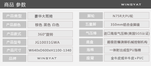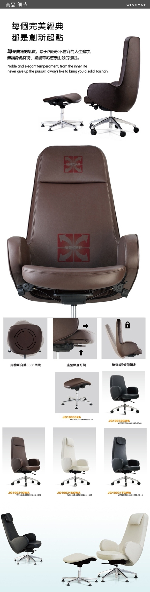 商品说明: 一体射出成型PU泡棉,内嵌头部调整器、背腰调整器。 座背全牛皮或半牛皮+PVC(集盛3006牛皮+集盛3006仿皮),体重感知式机构,气压升降,行程60mm气压棒。 350mm铝合金脚座、N75R大PU轮,不易伤地板。 尺寸:W730XD690XH1260-1310 设计特点:使乘坐的人有被包覆的感觉,依人体自身体重调节椅背反弹力,不需手动调整椅背舒适度,适合男性、女性主管乘坐。