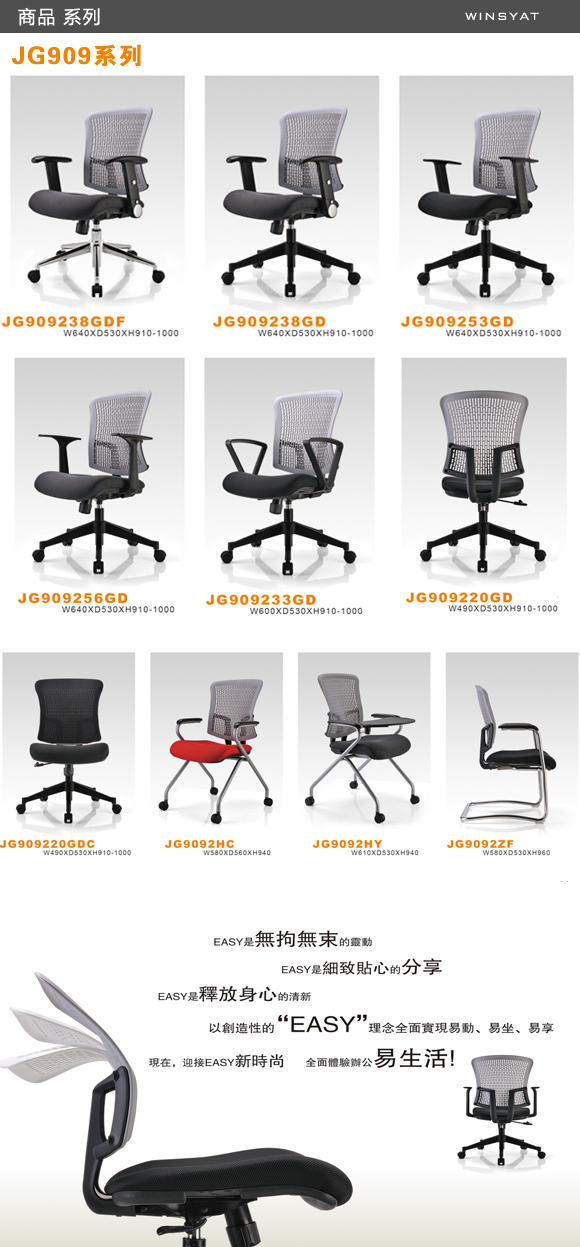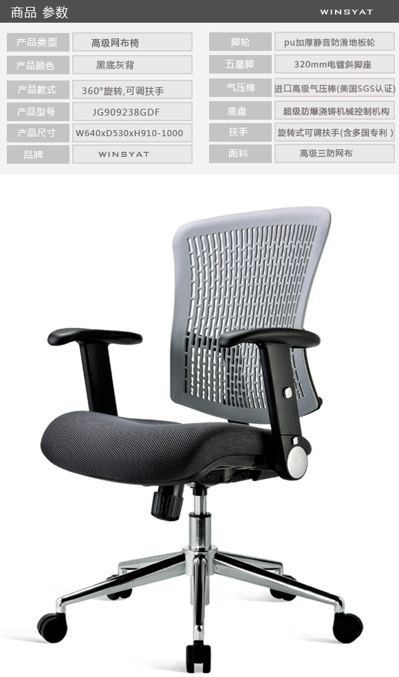 配件说明: 后背可无拘无束折弯、旋转式可调扶手(含多国专利) 同步底盘(3:1),座成型泡棉、背网 气压升降,行程100mm气压棒 320mm电镀斜脚座、N55R尼龙轮 尺寸:W640xD530xH910-1000